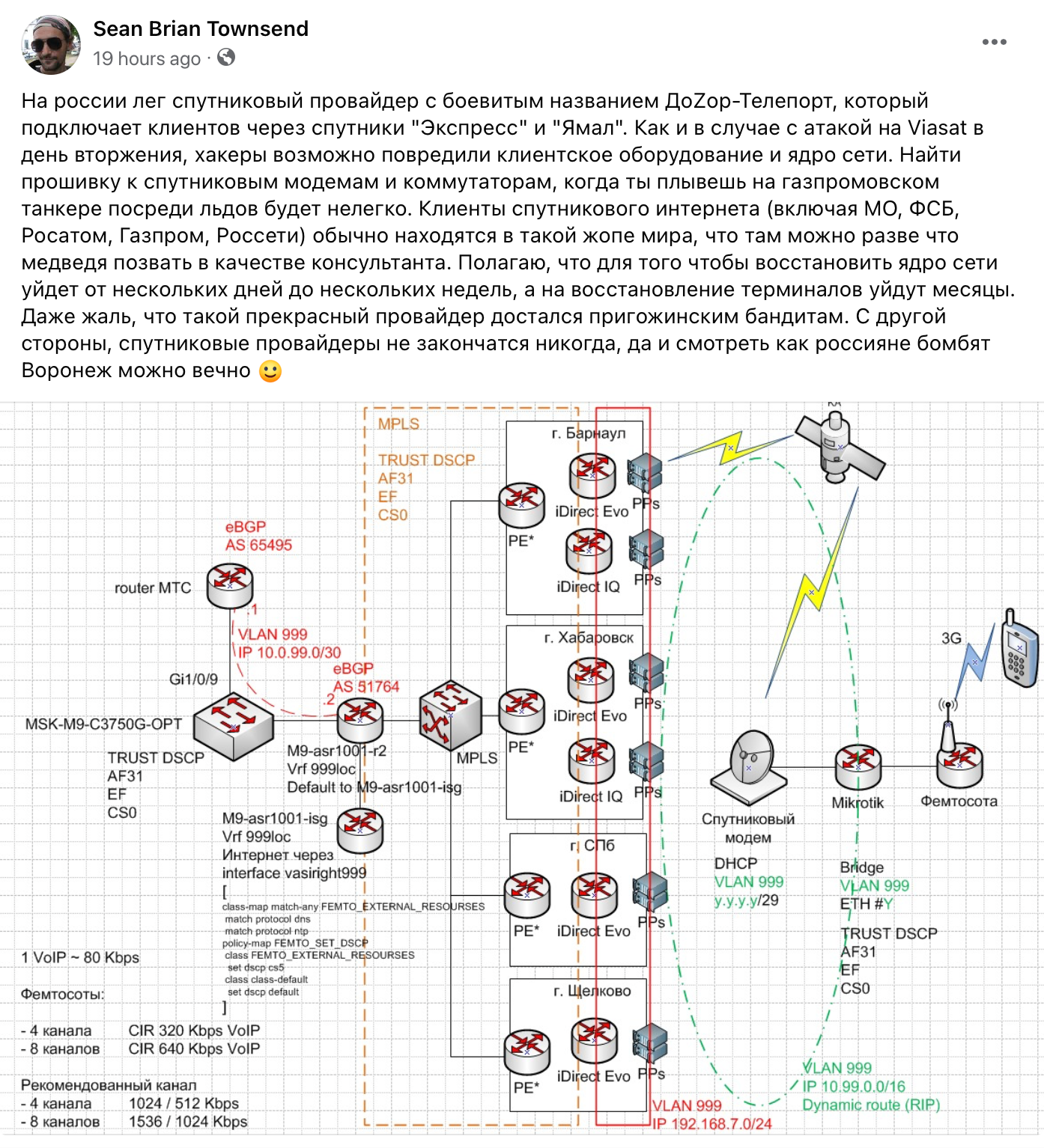 В сообщениях, появившихся в их свежесозданном телеграм-канале, говорится, что этот провайдер «обслуживает линии электропередач, нефтяные месторождения, воинские части МО РФ, ФСБ, пенсионный фонд и многие другие проекты, включая северный торговый флот и Билибинскую АЭС», и часть его спутниковых терминалов была выведена из строя.