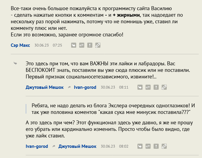 - сделать нажатые кнопки к комментам - и + жирными, так надоедает по нескольку раз порой нажимать, потому что не помнишь уже, ставил ли комменту плюс или нет.