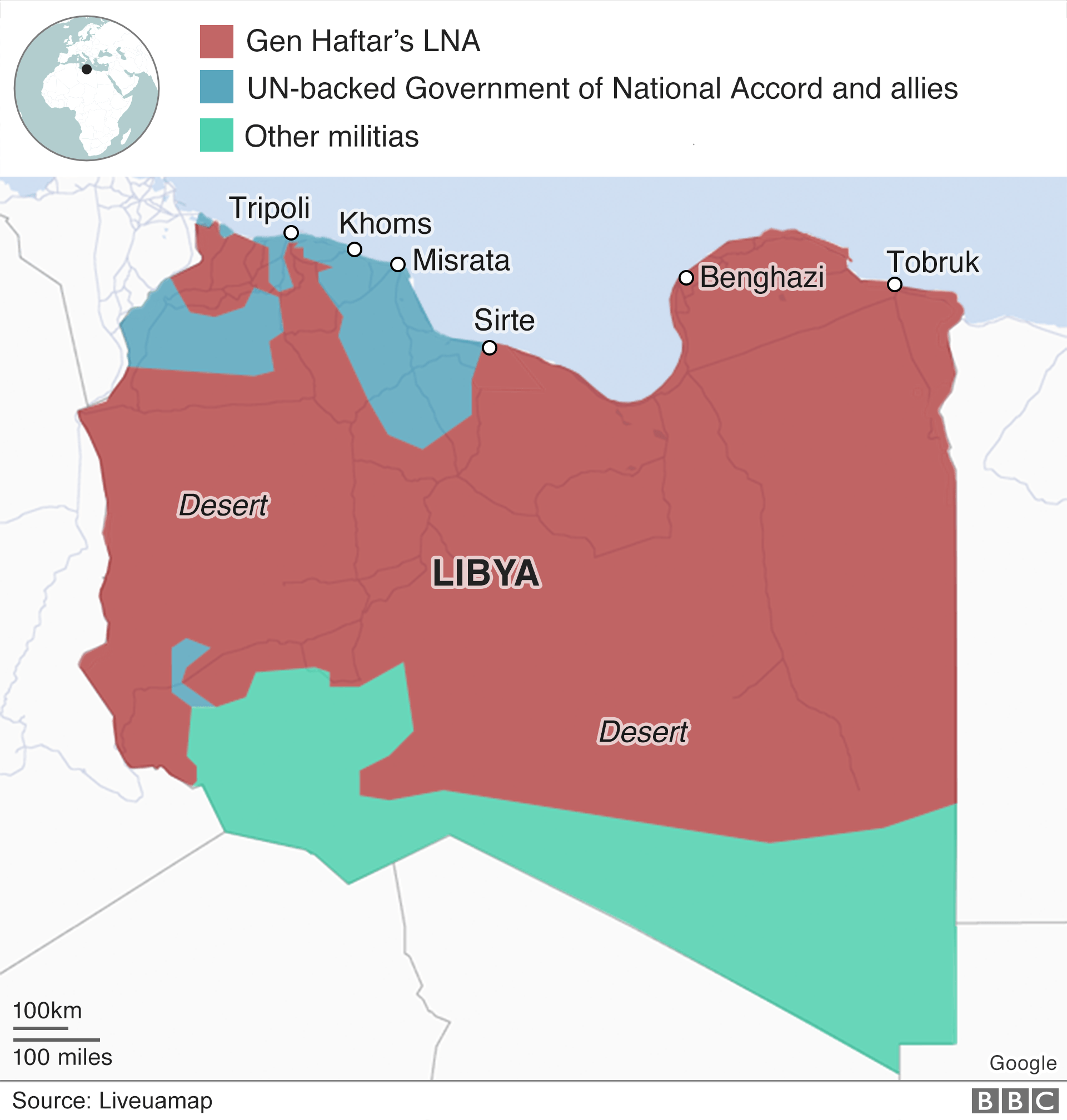 Для баланса, голубые - официально признанное ООН правительство, а красно-коричневые - самозванец Хафтар, по традиции поддерживаемый РФ. Ибо нефиг, европейский газовый и нефтяной рынки и так перенасыщены, национальное достояние в минус торгуется, а тут какая-то Ливия со своими объемами портит и так пошатнувшийся бизнес. Устроим им заварушку, благо военторги в пустыне работают 24/7.