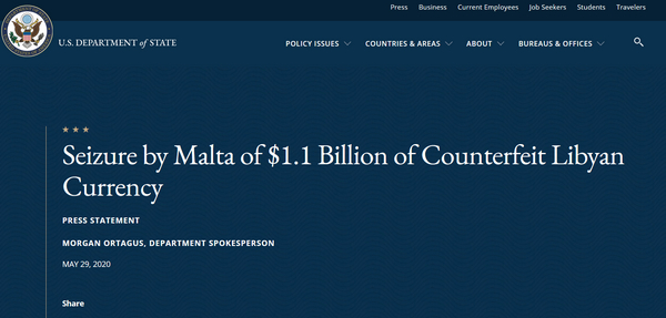 The United States commends the Government of the Republic of Malta’s announcement May 26 of its seizure of $1.1 billion of counterfeit Libyan currency printed by Joint Stock Company Goznak—a Russian state-owned company—and ordered by an illegitimate parallel entity. The Central Bank of Libya headquartered in Tripoli is Libya’s only legitimate central bank. The influx of counterfeit, Russian-printed Libyan currency in recent years has exacerbated Libya’s economic challenges. The United States remains committed to working with the United Nations and international partners to deter illicit activities that undermine Libya’s sovereignty and stability, and are inconsistent with internationally-recognized sanctions regimes. This incident once again highlights the need for Russia to cease its malign and destabilizing actions in Libya.