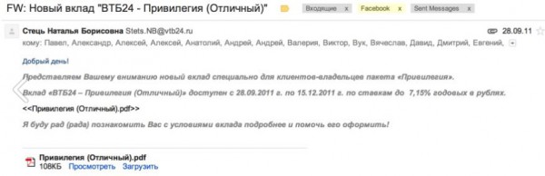 Судя по именам в записной книжке уровня Вася, Петя одно из двух- либо это спам (скорее всего, ибо это достаточно распространенная методика- типа случайных ликов, чтоб планктон потом еще и перепосчивал) либо это не вип клиенты. А вообще конечно надо бы еще заголовки посмотреть письма. Есть подозрение что это даже не из ВТБ послано.