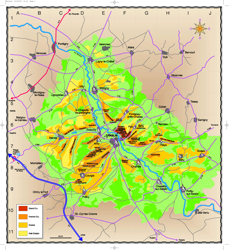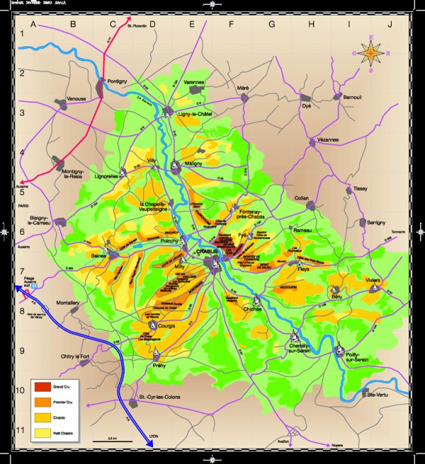 Карта региона, самым темным цветом обозначены виноградники Шабли Гран Крю.