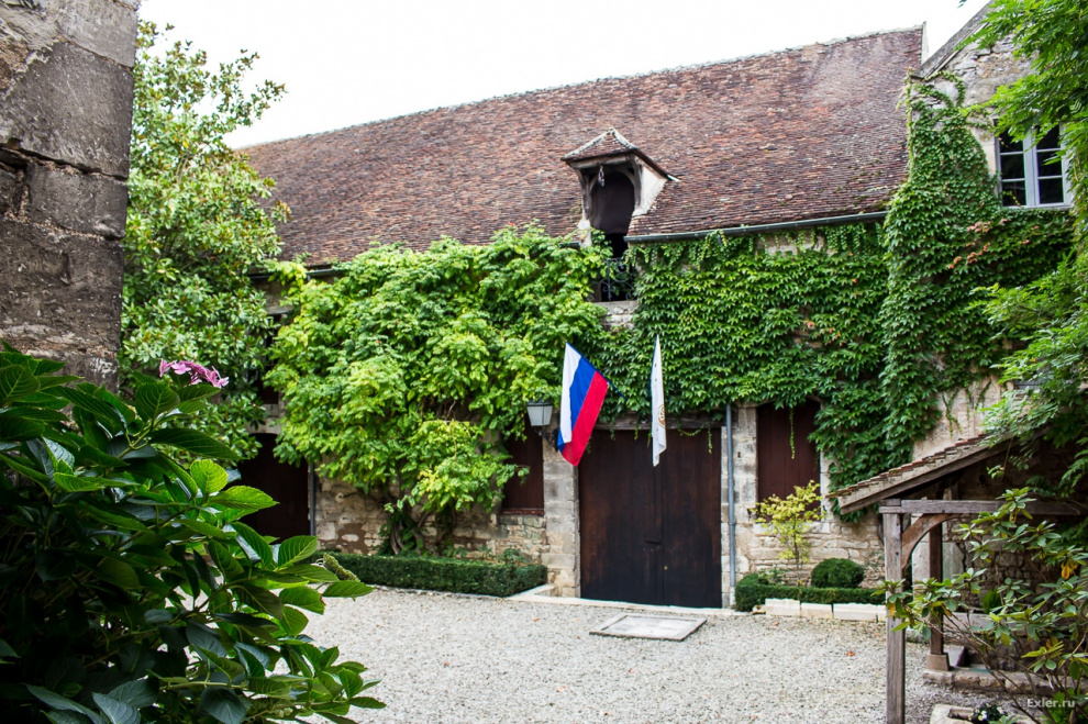 Уютный дворик офиса, флаг России - в нашу честь. Вот всем бы офисам иметь такие дворики... Впрочем, это не совсем офис. Некоторое время назад это строение было жилым домом: в нем жил Мишель Ларош, владелец хозяйства. Потом Мишель переехал, а здесь разместили офис.