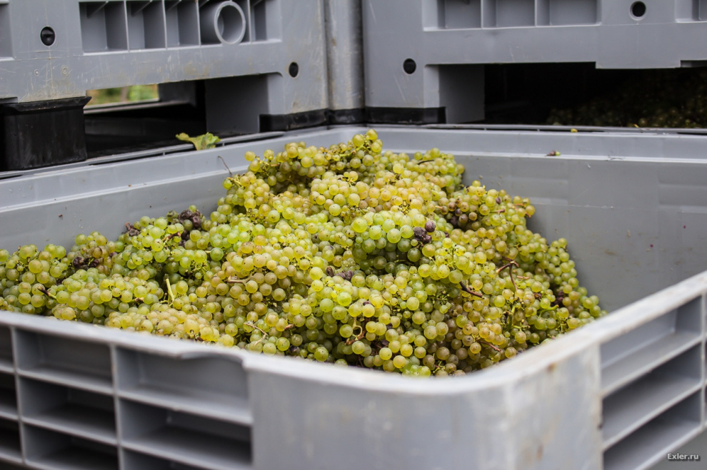 Потом вот таким способом виноград ссыпается в специальные емкости.