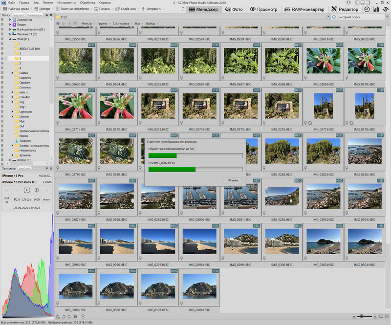 Скачал на компьютер тестовые фото из 13-го айфона и с удивлением выяснил, что они все сделаны в формате HEIC, который под Windows практически ни одно приложение не понимает в упор. Есть там какие-то костыли в виде конвертера в JPEG, но этот конвертер почему-то умеет конвертировать только один файл, никак не группу. А отличный FastStone Image Viewer этот формат не понимает.