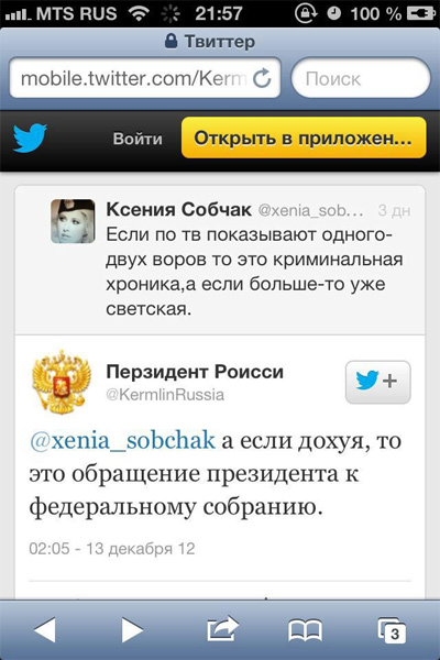 А что - в Твиттере не принято ставить значок (с) - чтобы показать, что это цитата? А то ведь выходит, что Ксюша украла чужой афоризм и выдает его за свой. Или я чего-то не понимаю?