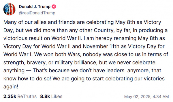 Многие наши союзники и друзья отмечают 8 мая как День Победы, но мы сделали гораздо больше, чем любая другая страна, для достижения победы во Второй мировой войне. Настоящим я переименовываю 8 мая в День Победы во Второй мировой войне, а 11 ноября — в День Победы в Первой мировой войне. Мы выиграли обе войны, никто не мог сравниться с нами по силе, храбрости или военному гению, но мы никогда ничего не празднуем — потому что у нас больше нет лидеров, которые знают, как это делать! Мы снова начнем праздновать наши победы!