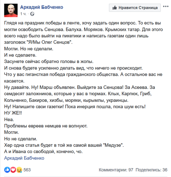 Так что Бабченко не прав, а уж после того как эту журналистскую общественность в растраты ввел (кто венок почти купил, кто телеграмму отбил, кто в фейсбуке написал) вообще должен сидеть и помалкивать.