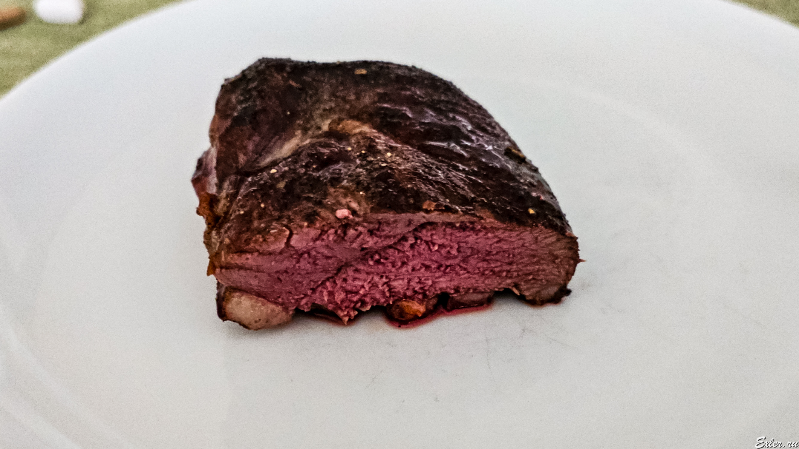 А вообще я никогда не проверяю мясо термометром; ибо "глаз - алмаз"; ни единого раза не отравился. Пересушил мясо, кажется, всего один раз - баранина кружилась на вертеле, я поехал встречать любовницу, а её авиарейс запоздал на полчаса. Но это был чистого разлива форс-мажор! Впрочем, баранина не утка, пострадала не сильно.