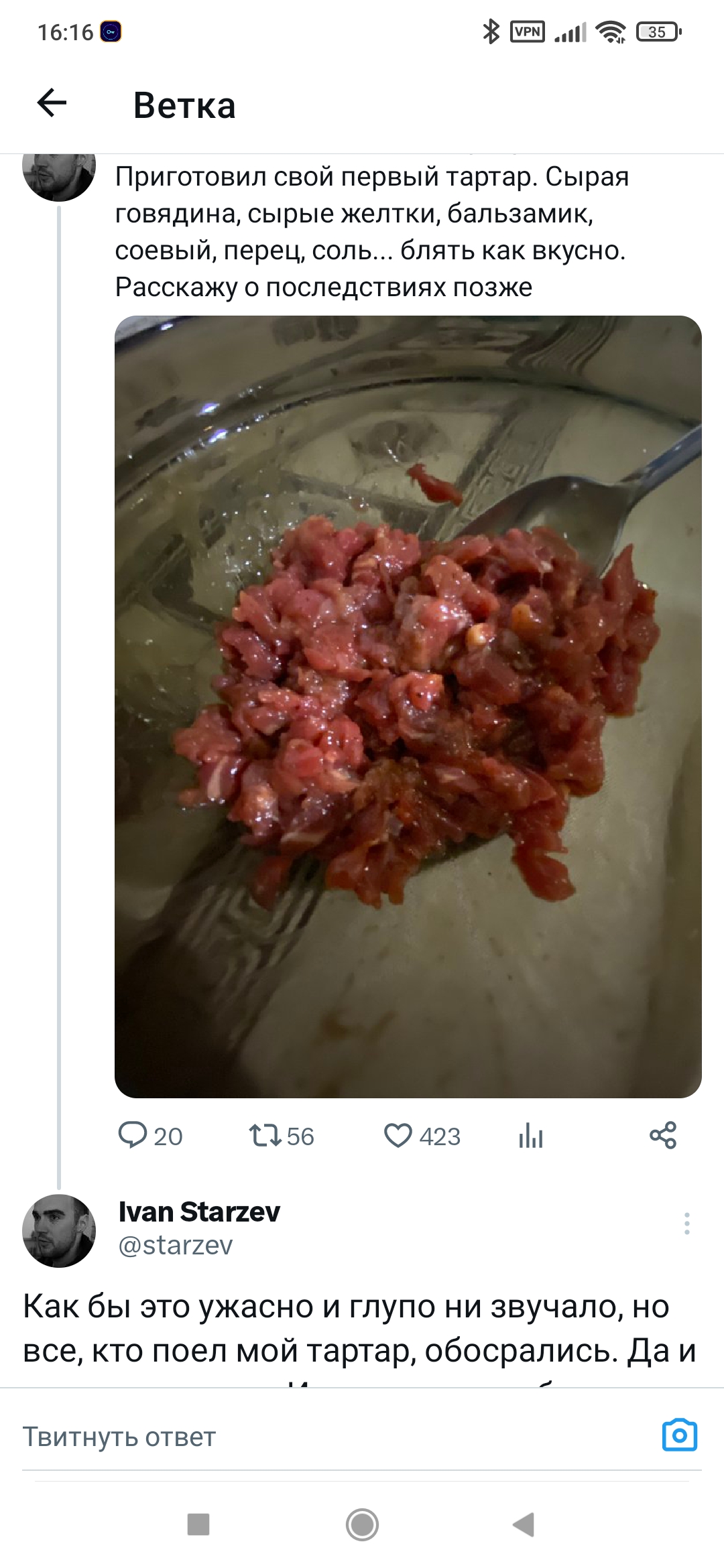 Я как-то пропустил момент, что поедание сырого мяса переехало из карательной кулинарии эвенков в модный ряд между хрустящим салатом и стаканом смузи. Паразитов уже не боимся? Я бы тоже этот сырой фарш пожарил бы, как дядя Карл.