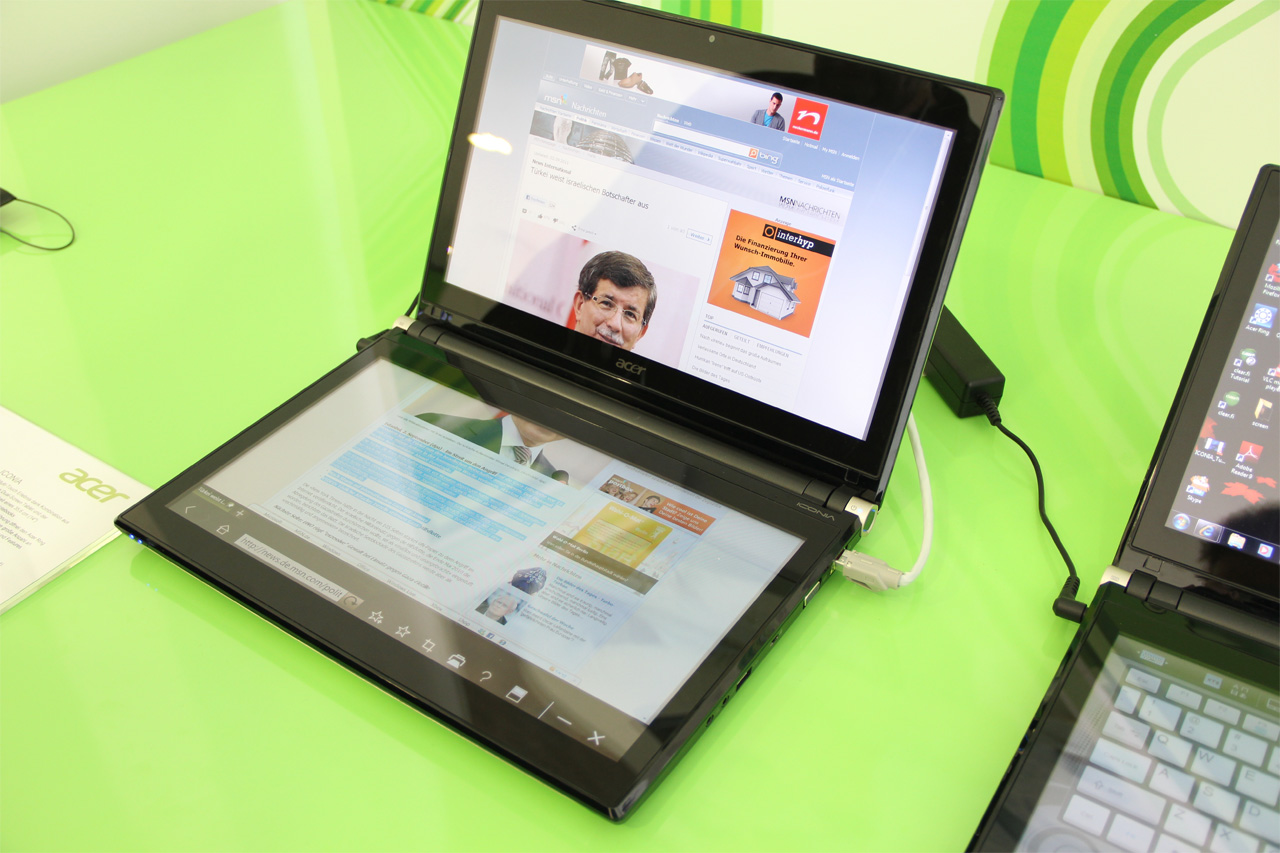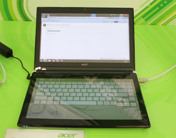 А вот это двухдисплейный Acer Iconia под Windows 7. Стоит прикоснуться к нижнему экрану - появляется полноформатная виртуальная клавиатура.