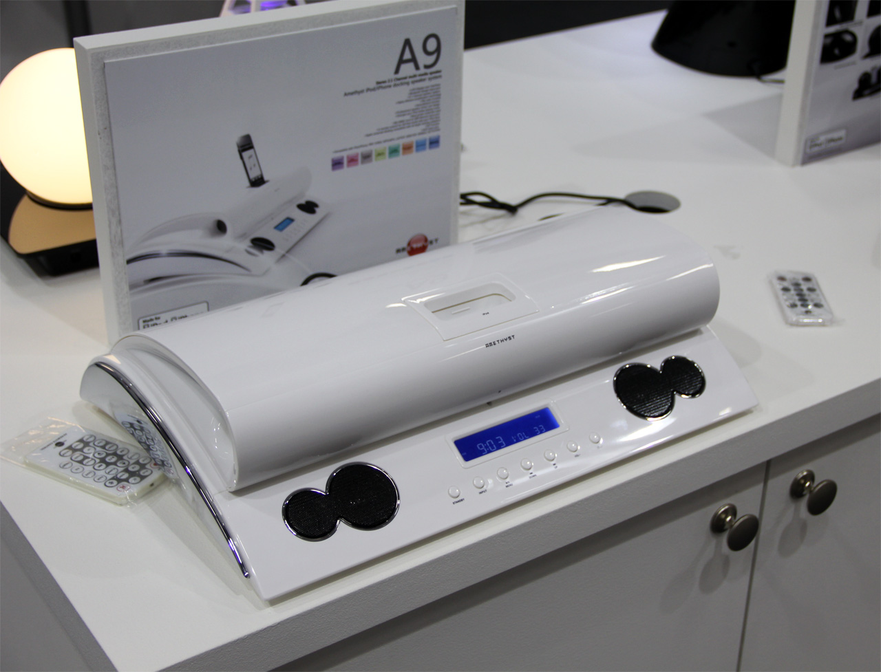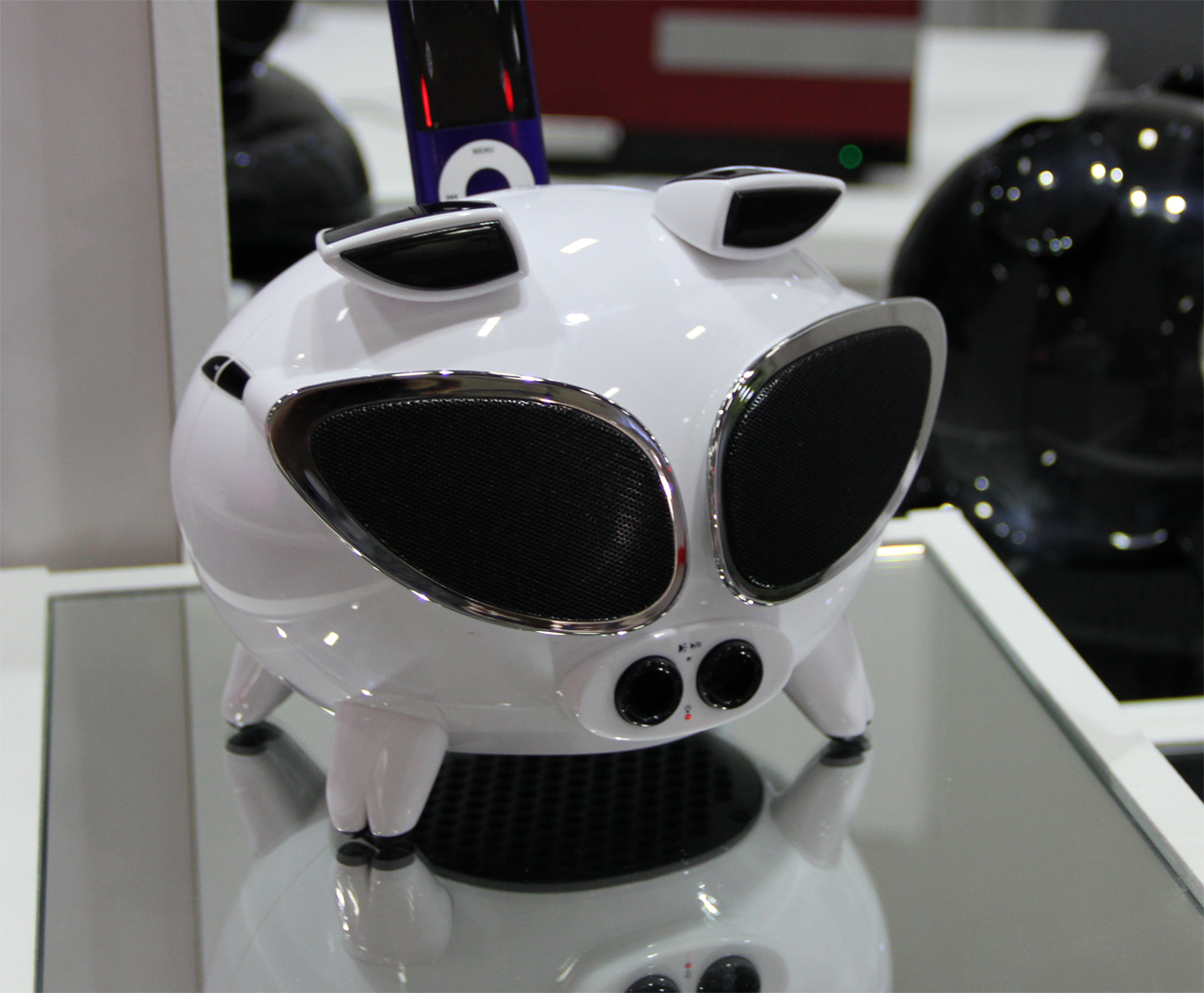 Док в виде свинки, причем кроме любопытного дизайна - оригинальная регулировка громкости: подносите ладонь к левому уху - звук плавно становится тише, к правому - громче.