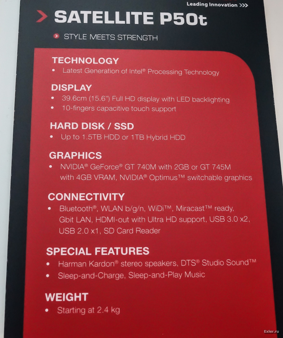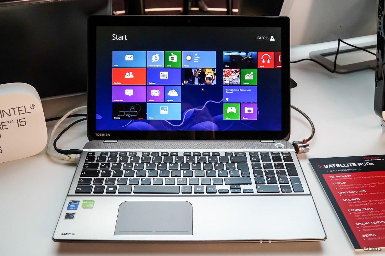 Ноутбук Satellite P50t. Мощная машинка, 15,6" сенсорный FullHD с LED-подсветкой, приличная графика, может комплектоваться гибридным диском на 1 Тб (или обычным на 1,5 Тб).