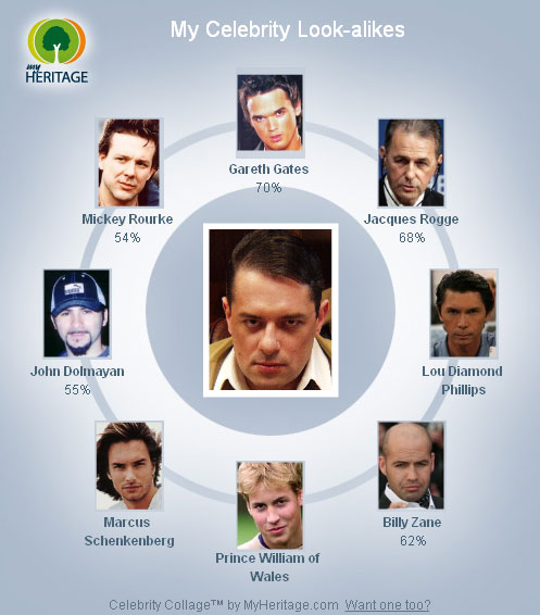 Я похож на Орландо Блума (OMG, LOLZ), какого-то Джона (не Джеймса) Белуши, какого-то АХРОАМЕРИКАНЦА (враньё, шоб с сдох!), Ральфа Шумахера и Х.П. Монтойю. Что интересно, я действительно немного похож на Монтойю.