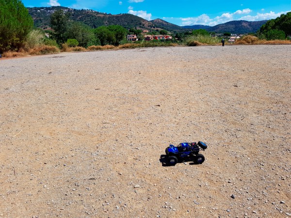 Машинка довольно мощная, вперед катится очень шустро, несмотря на каменистое покрытие. Мы еще ее сравнили с другой радиоуправляемой игрушкой, которую купили давно за примерно такие же деньги - та на такой поверхности ездила довольно медленно. Но она и не внедорожник, для асфальта. А эта носилась вовсю.