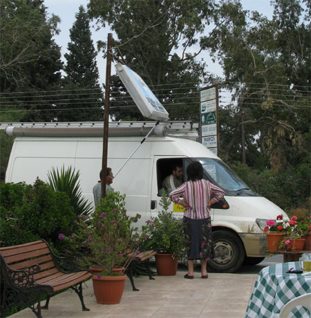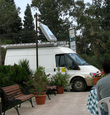 Вывеска скрежещет, сопротивляется, в общем, шум стоит - страшный. Мы подумали, что сейчас из ресторанчика выскочат горячие греческие хозяева и будут долго если не давать по шее водителю, то уж хотя бы объяснять, куда он должен засунуть свои глаза и что они сделают с крышей его дома.