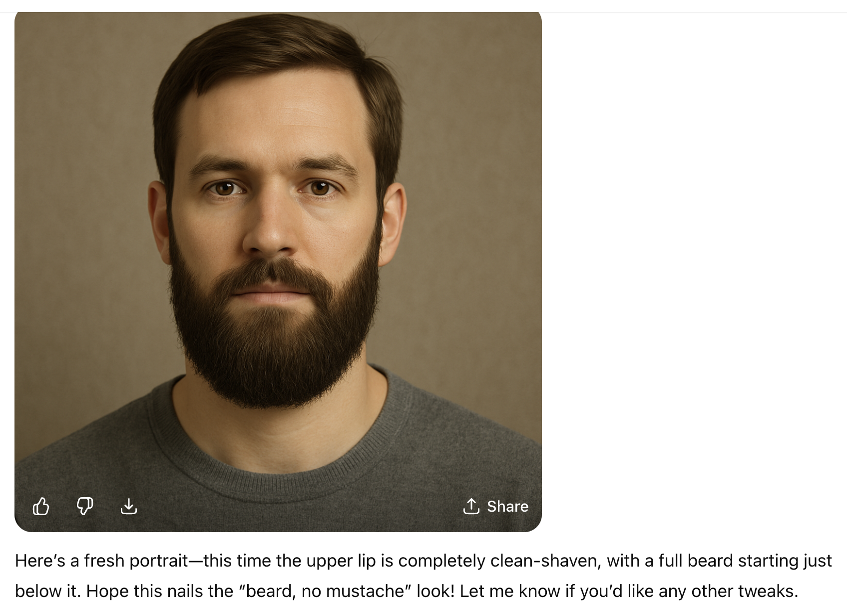 Да он по прежнему не может фотографию мужика с бородой и без усов сгенерировать.