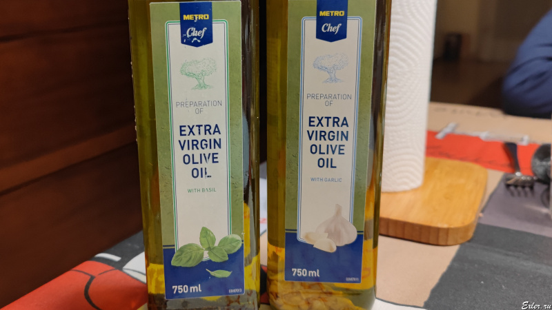 И еще один важный момент. В Metro (возможно, в российском Metro такое тоже есть, поэтому и написал), купили вот такие варианты оливкового масла холодного отжима с чесноком (это больше для салатов), базиликом и трюфелями (с трюфелями в кадр не попало, но оно так же выглядит).