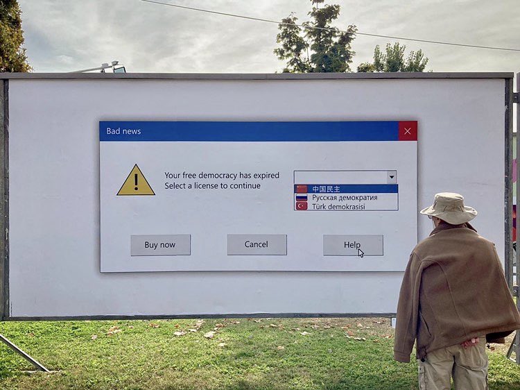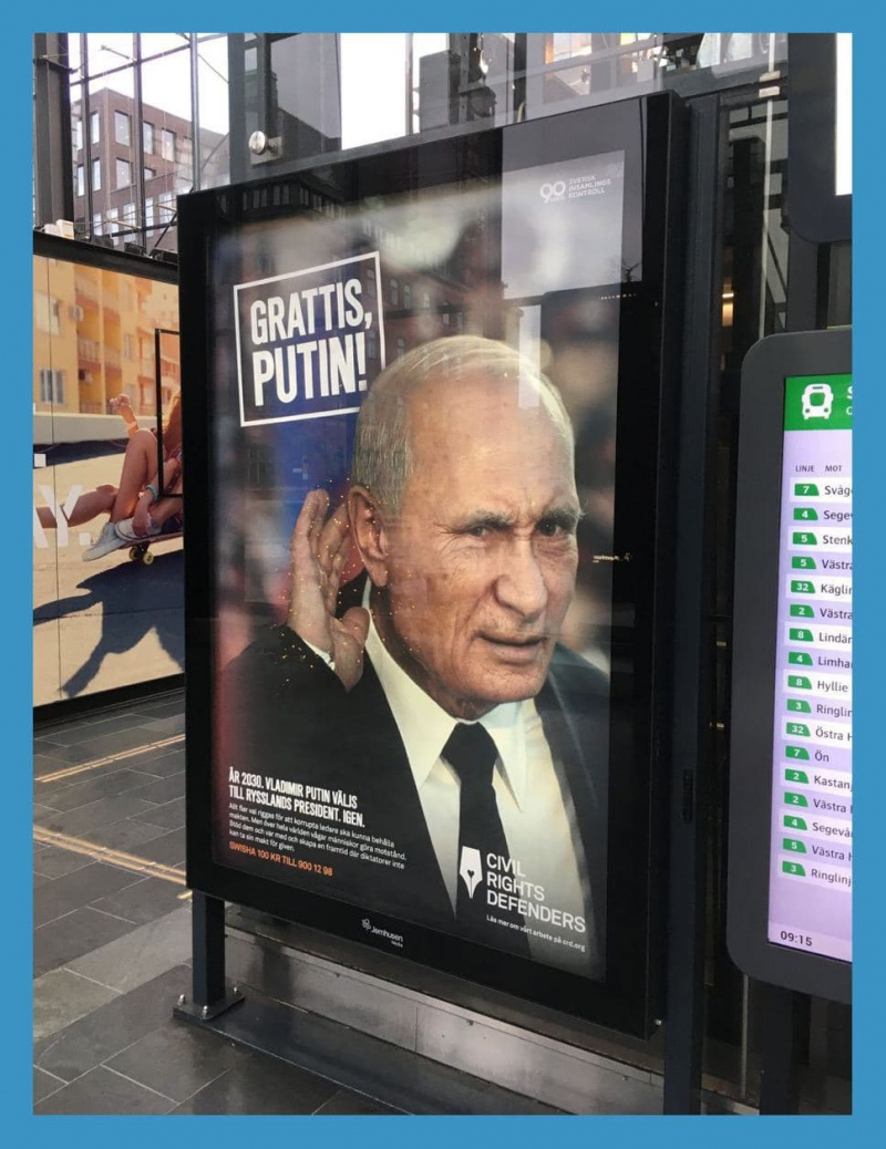 Такие билборды висят в Швеции: «Путин, наши поздравления! 2030 год, Путин избран президентом России. Ещё раз». Плакат организации борьбы за демократические свободы и права человека. Такие же плакаты есть с Асадом и с президентом Венгрии. (Отсюда.)