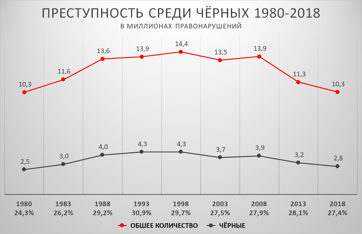 Вы это сейчас на полном серьёзе? То есть большинство черных преступников, сидящих в тюрьме, это невинные овечки, которых посадили проклятые белые полицейские расисты? Просто нет слов. Еще раз, черные РЕАЛЬНО совершают в несколько раз больше преступлений, чем белые. Как я уже говорил, основная причина тут социальная, бедность и плохое образование, а дальше идёт так называемая "ловушка бедности" из которой не всем удаётся вырваться. Средний доход черной семьи в США 58% от среднего дохода белой.