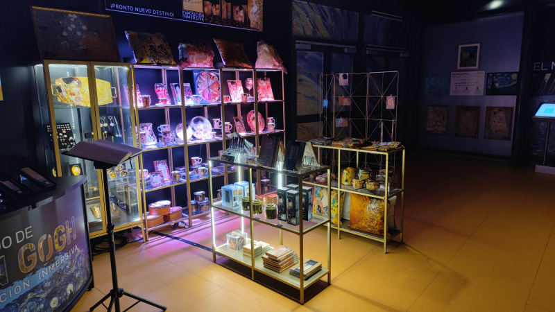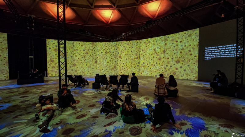 Что такое "иммерсивная выставка"? (В испанском звучит почти так же - La exposición inmersiva.) Иммерсивная - это создающая эффект погружения. То есть это не просто демонстрация слайдов с картинами: экраны расположены по всему кругу и изображение проецируется на 360 градусов, картины так или иначе анимированы, анимированное изображение также проецируется на пол, все это сопровождается музыкой и закадровым текстом о жизни художника.