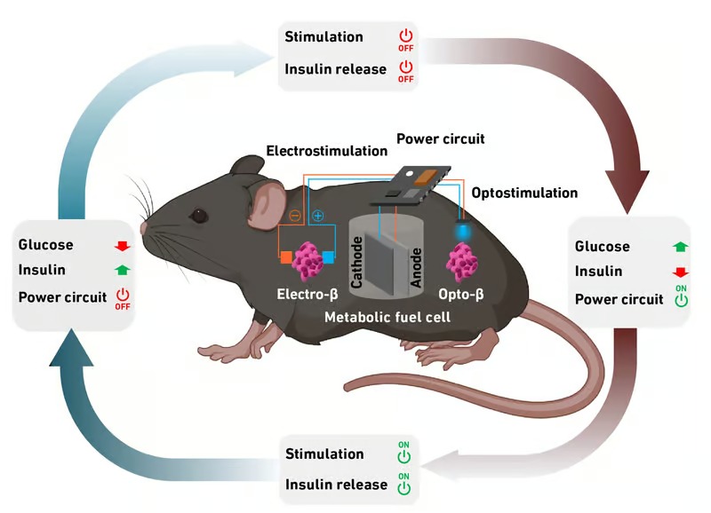Затем топливный элемент соединили с инсулиновой капсулой, содержащей бета-клетки — их можно активировать для выделения инсулина с помощью электрического тока от имплантата. То есть, когда топливный элемент, работающий на глюкозе, распознаёт избыток сахара в крови, он включается, стимулируя бета-клетки вырабатывать и секретировать инсулин. А когда уровень сахара в крови падает, срабатывает датчик порога в топливном элементе, и тогда он отключается, что, в свою очередь, останавливает выработку и высвобождение инсулина. Таким образом, эти два компонента обеспечивают самоподдерживающийся цикл, нивелирующий проблемы сахарного диабета первого типа.