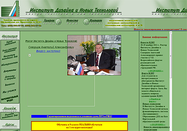 С удовольствием рекламирую сайт "Института дизайна и новых технологий". Это, конечно, аццкая жесть. Такой кошмар даже в 1999 году было сложно сделать, а уж в 2011, да еще и сайт "Института дизайна" - это они просто зажгли! Автор этого творения - некий Мирзаахмедов Арабжон Мухтарович, причем он почему-то не стесняется в этом признаться. И это еще и версия 3.0 - представляю, что там было в версии 1.0 и 2.0.