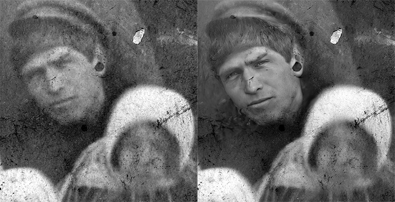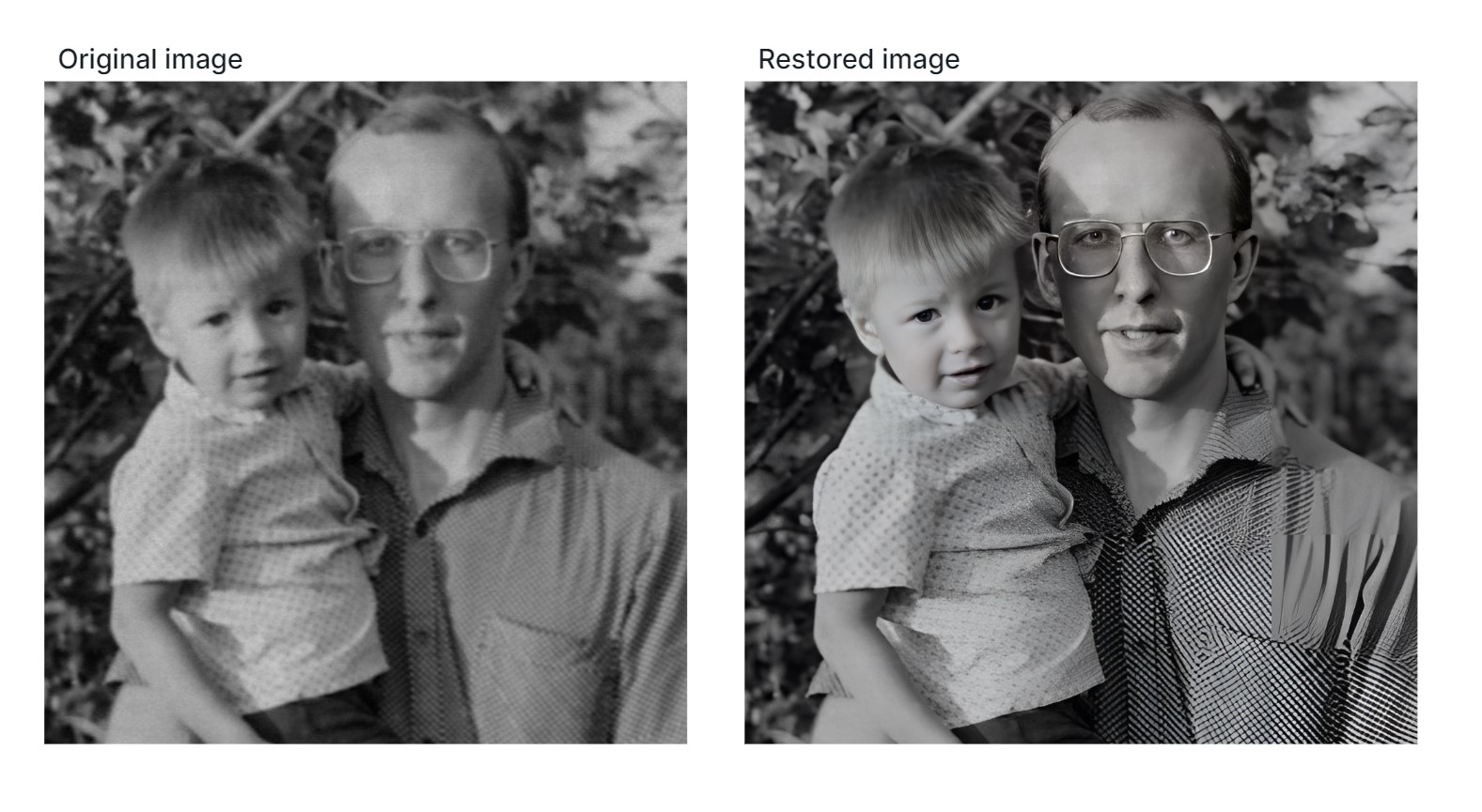 Теперь возьмем совсем некачественное изображение. У мужчины лицо вытянули прям здорово, хотя и не отремонтировали повреждения на фото. Лицо ребенка вытянуть не смогли, но и неудивительно - там деталей нет совсем.