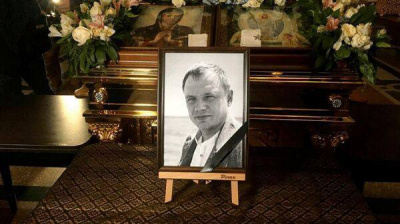 Тело в гробу на похоронах Стремоусова укрыто вуалью.