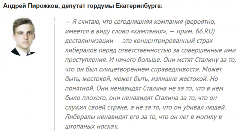 По мнению Пирожкова, ... Сталин уйдет в историю, «когда у нас появится разумное руководство»."