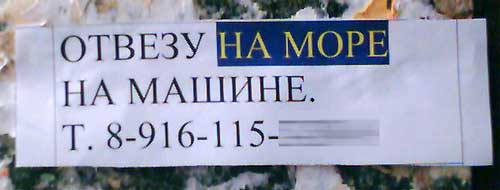 Встретил на стене объявление, которое оставило меня в глубокой задумчивости. Что это? Попытка найти девчонок-попутчиц? Или что? Сам еще не звонил. Я стесняюсь ездить на море с незнакомыми мужчинами. Да еще и на их машине. Фиг знает, вдруг там кондиционера нет...
