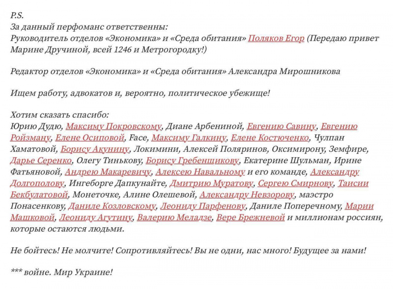 Я считаю, что всем противникам войны сейчас необходимо объединиться, невзирая на их взгляды. <...> Подписи наши, со мной уже побеседовали, полагаю, что можно говорить о том, что мы в «Ленте» более не работаем".