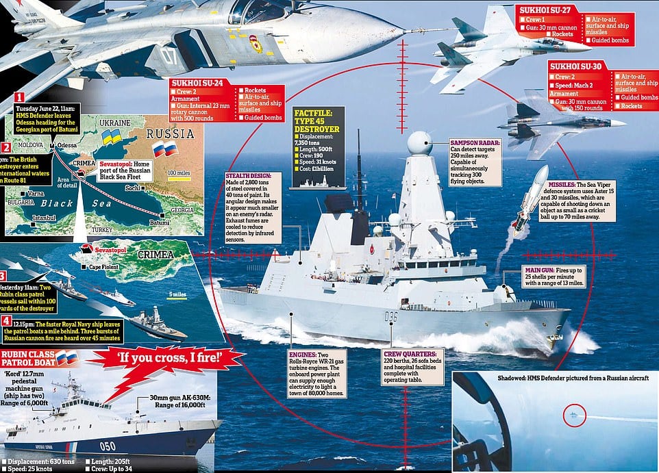 4) Британцы при этом шли по этому маршруту вполне осознанно и ожидая подобной реакции России. Россия все чаще закрывает большие участки Черного моря, Британия хочет показать, что мирно плавать - по международным договорам - можно более-менее везде, и это была такая силовая демонстрация. Ну и вернуть статус лидирующей морской державы хочется.