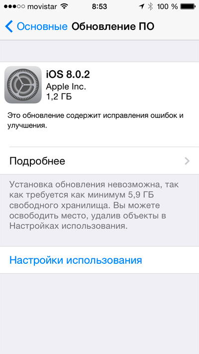 На айфоне жены с 16 гигами памяти 8.0.2 потребовала для установки 5,9 (!) гигабайт! Присовокуплю скриншотик. 6 гигов требуется для установки обновления размером в 1,2 Гб. Как мило!