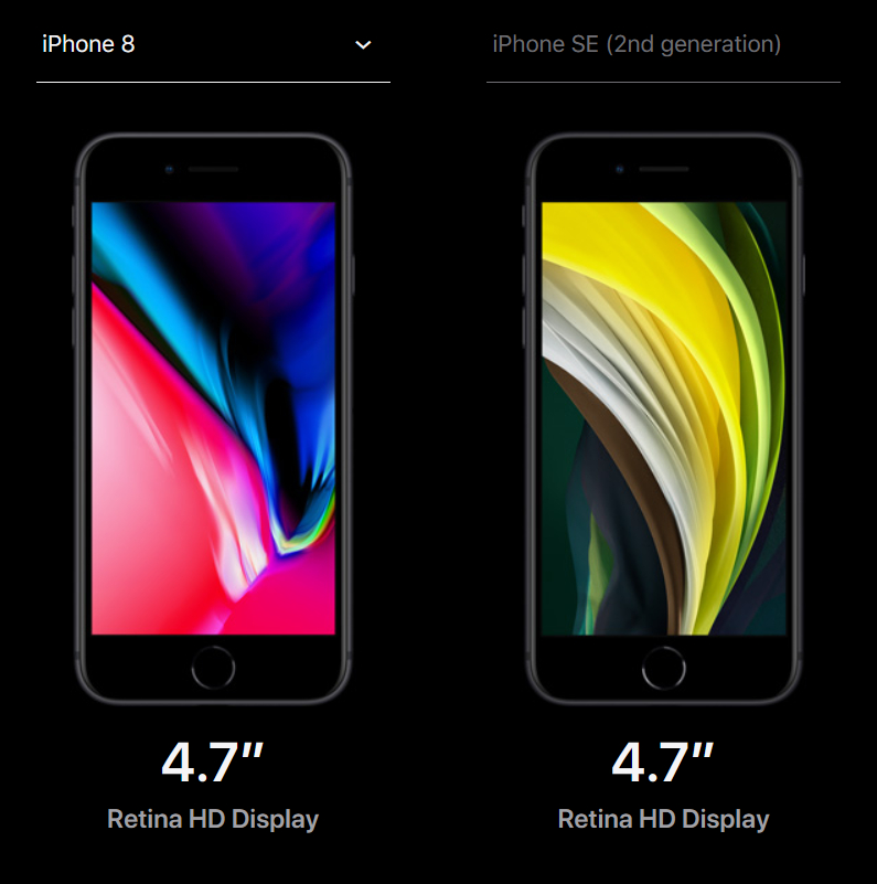 Прочитал новость про выход iPhone SE второго поколения. Там было приведено изображение этого смартфона - нового айфона 2020 года выпуска. Я увидел - и офонарел. Они что, серьезно? На сайте Apple можно сравнить новый айфон с другими моделями. Вот он рядом с восьмеркой, айфоном трехлетней давности. Какой прогресс, господа, я в полном восхищении! В 2020 году выпускать смартфон с толстенными рамками сверху снизу - это реально красивое решение!