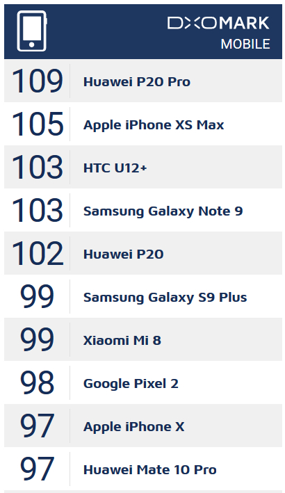 Спецы издания DxOMark протестировали iPhone XS Max и поместили его в рейтинговую таблицу. 105 баллов, второе место (вот полный обзор). Это означает, что камера очень хорошая. Но приятно то, что Huawei P20 Pro первое место так и не уступил.