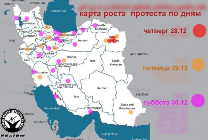 Протест вообще началася позавчера в одном городе после обычного подорожания яиц в 2 раза. За три дня митингует уже полстраны. Лозунги перешли от экономических до политических. Уже требуют освободить политзаключённых, перестать воевать в Сирии и остановить исламизацию страны. Вообще власть в стране держит духовенство, и оно же призывает подавить демонстрации самыми жёсткими способами. (Отсюда.)