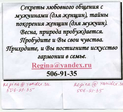 Мы с пацанами объявление сорвали и по случаю шаббата сели пить горячительные напитки, горячились и играли в покер. Параллельно мы названивали этой Регине - из любознательности хотели выяснить тайны покорения мужчины мужчиной и женщины женщиной. Ну и к тому же было интересно, владеет ли Регина широким спектром знаний. Ан фиг - автоответчик. Так мы и не узнали этих тайн, обидно...