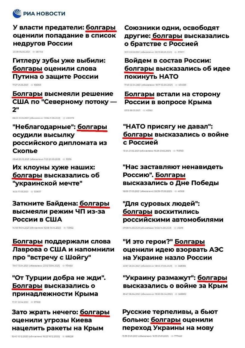 По версии ура-заголовков множества российских новостей – именно болгары (почему-то) чаще всех якобы "восхищаются-завидуют-поддерживают" вообще чуть ли не любые российские действия (хотя на самом деле там обычно приводятся либо всего лишь несколько каких-то рандомных комментариев из "болгарских соцсетей", либо "авторитетное мнение" какого-нибудь болгарского фрика-"ыксперда")).
