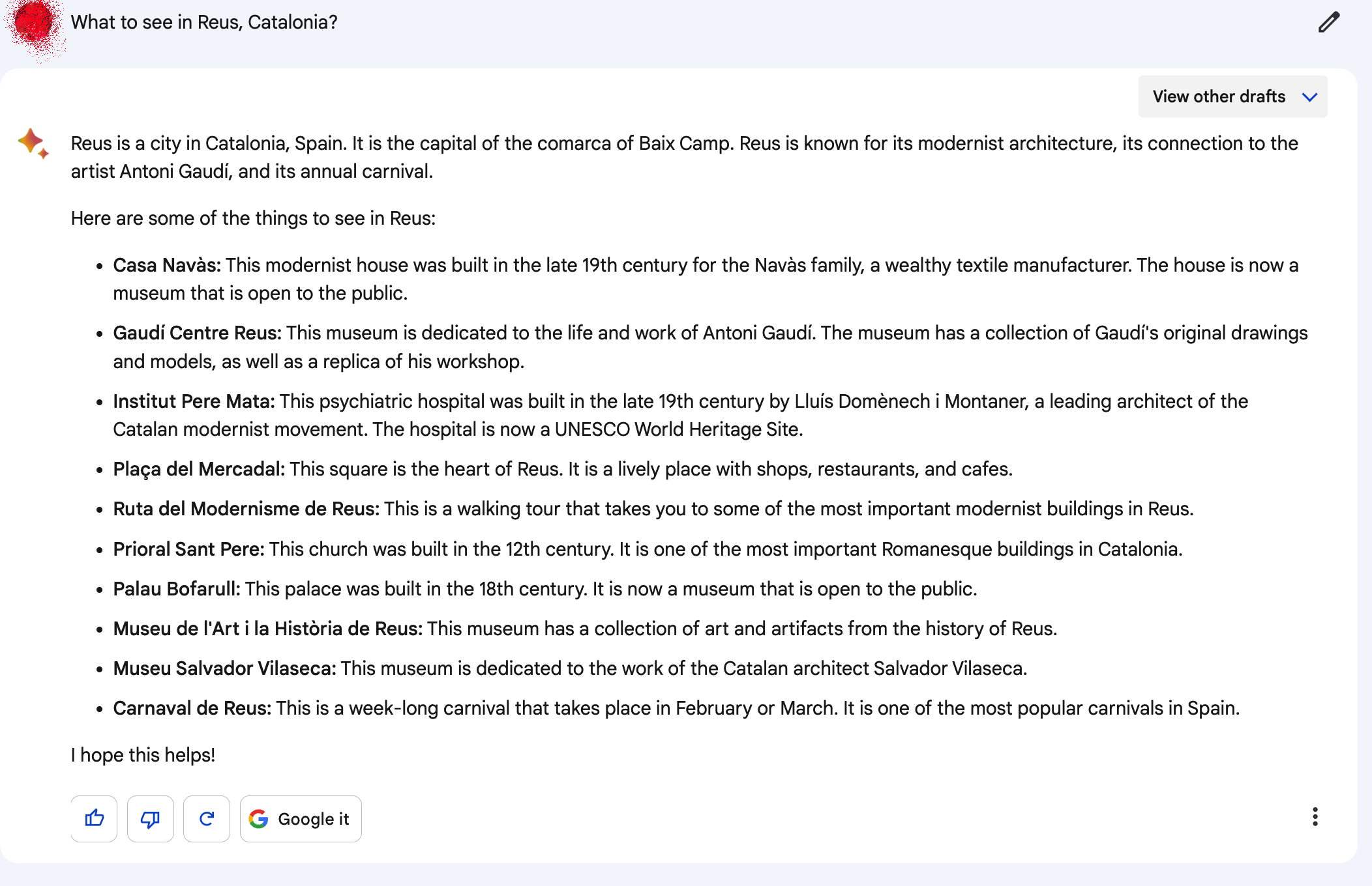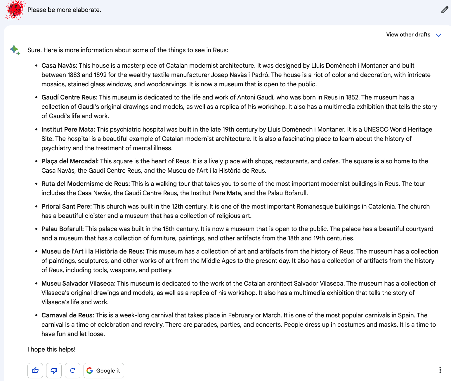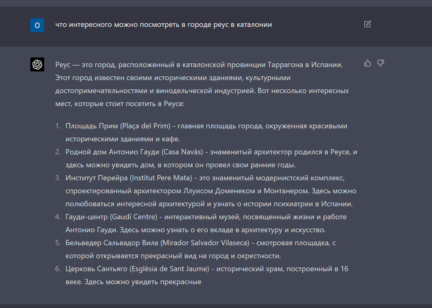 Вот его перевод его ответа на вопрос какие места стоит посетить туристу в Реусе: