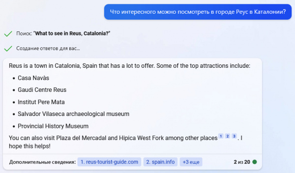 Я сейчас нахожусь в городе Реус (приехал на одну ночь, сегодня уже домой), ну и решил спросить у тополя и ясеня, что именно здесь, в Реусе, посмотреть, благо мы все уже посмотрели, так что сможем оценить ответы.