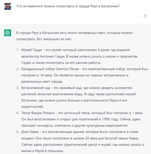 Видимо, одни из "опасностей ИИ", о которых беспокоится инициативная группа критиков - это завышенные ожидания и непонимание границ применимости. ChatGPT - это о поддержании диалога и компиляции "человекоподобных" ответов - причем идет ли речь о глоких куздрах или музее Гауди - ему (ей?) все равно. То есть задав свой вопрос - Алекс фактически попросил составить правдоподобный текст на заданную тему, без всякой связи с фактами.
