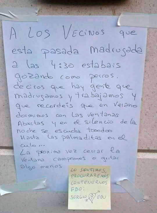 Текст объявления: "Дорогие соседи, которые в прошлую ночь трахались как собаки! Хотим вам сказать что мы, жители этого скромного дома, рано встаем и работаем, а летом мы спим с открытыми окнами, потому что сейчас жарко, и в тишине ночи отлично слышно все, даже ваши хлопки по жопе! Просим вас либо окна закрывать, либо чуть потише вопить"!