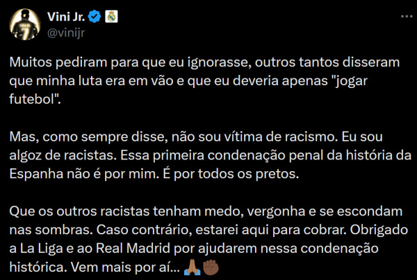 Пусть другие расисты боятся, стыдятся и прячутся в тени. Иначе я буду здесь, чтобы собирать деньги. Спасибо Ла Лиге и мадридскому "Реалу" за то, что помогли добиться этого исторического осуждения. Дальше будет больше...