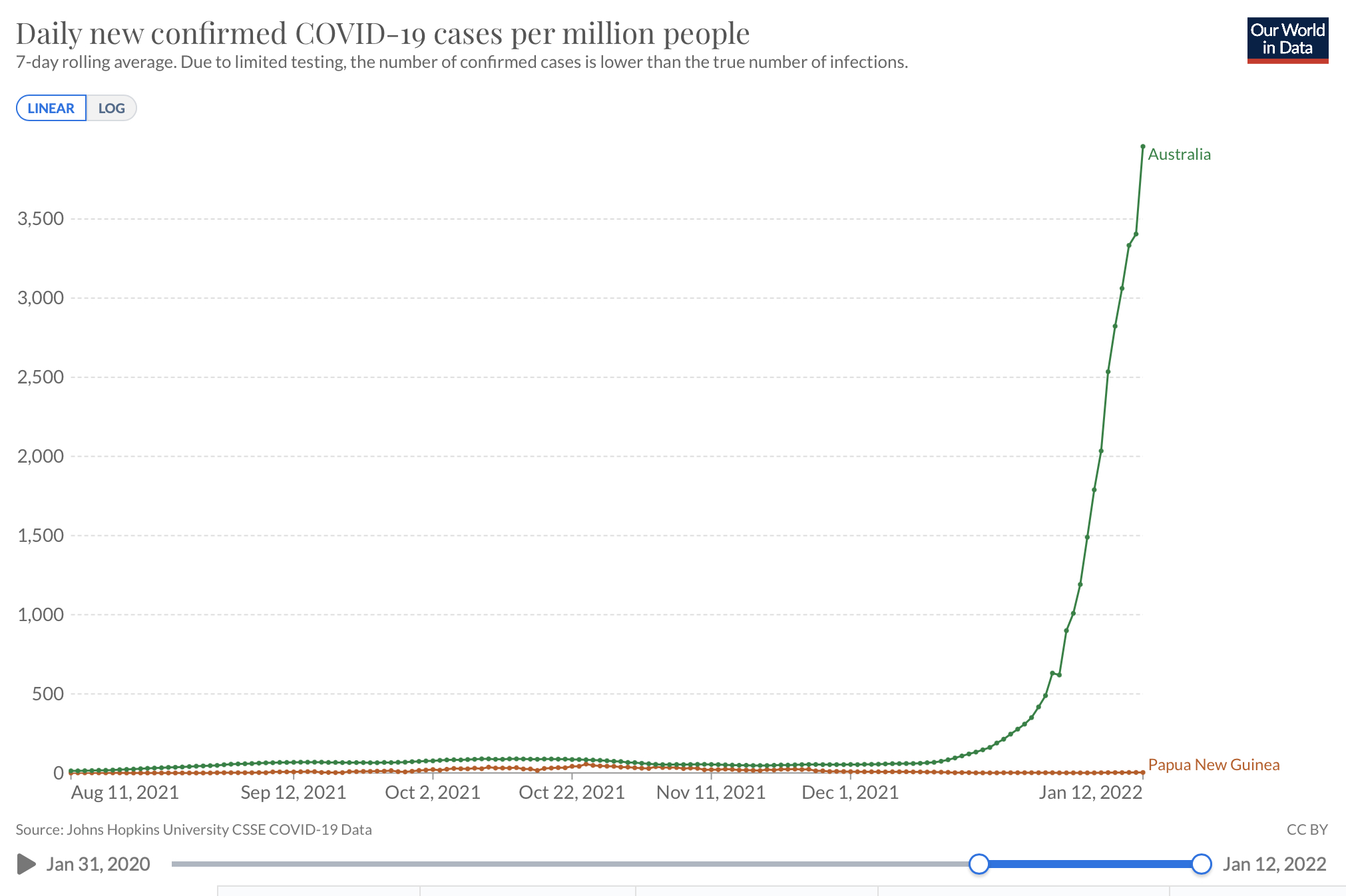 Ну тут вообще всё просто: нет тестов - нет больных.проведено тестов на 1 миллион населения:Австралия - 2,237,359 Папуасы - 27,064