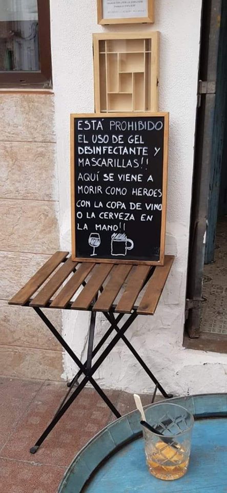 На плакате надпись: "Запрещается использовать дезинфицирующий гель и маски! Сюда приходят умирать как герои: с бокалом вина или кружкой пива в руке"!