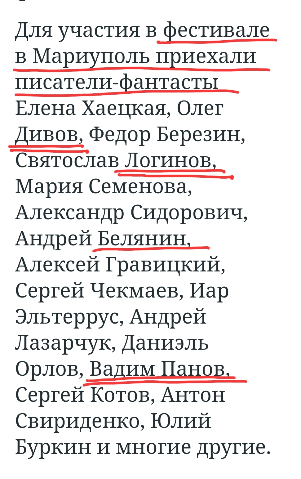 Также мы помним "крупнейший международный" фестиваль фантастики, проведенный в Мариуполе, и мы помним, как эта писательская сволочь рассказывала, как нынче хорошо и вольно дышится в городе, где рашисты уничтожили десятки тысяч мирных жителей.