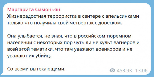Руководительница пропагандистского канала "Russia Today" Маргарита Симоньян публично пообещала Дарье внесудебную расправу в тюрьме.