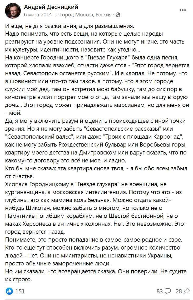В общем, совершенно четко понятно, что никакой Десницкий не белый и не пушистый, что он сам был проводником путинской пропаганды (в чем его в той же статье обвиняет издатель из Украины Евгений Аврамчук, который с Десницким когда-то дружил), а следовательно - он причастен к разжиганию этой безумной войны.