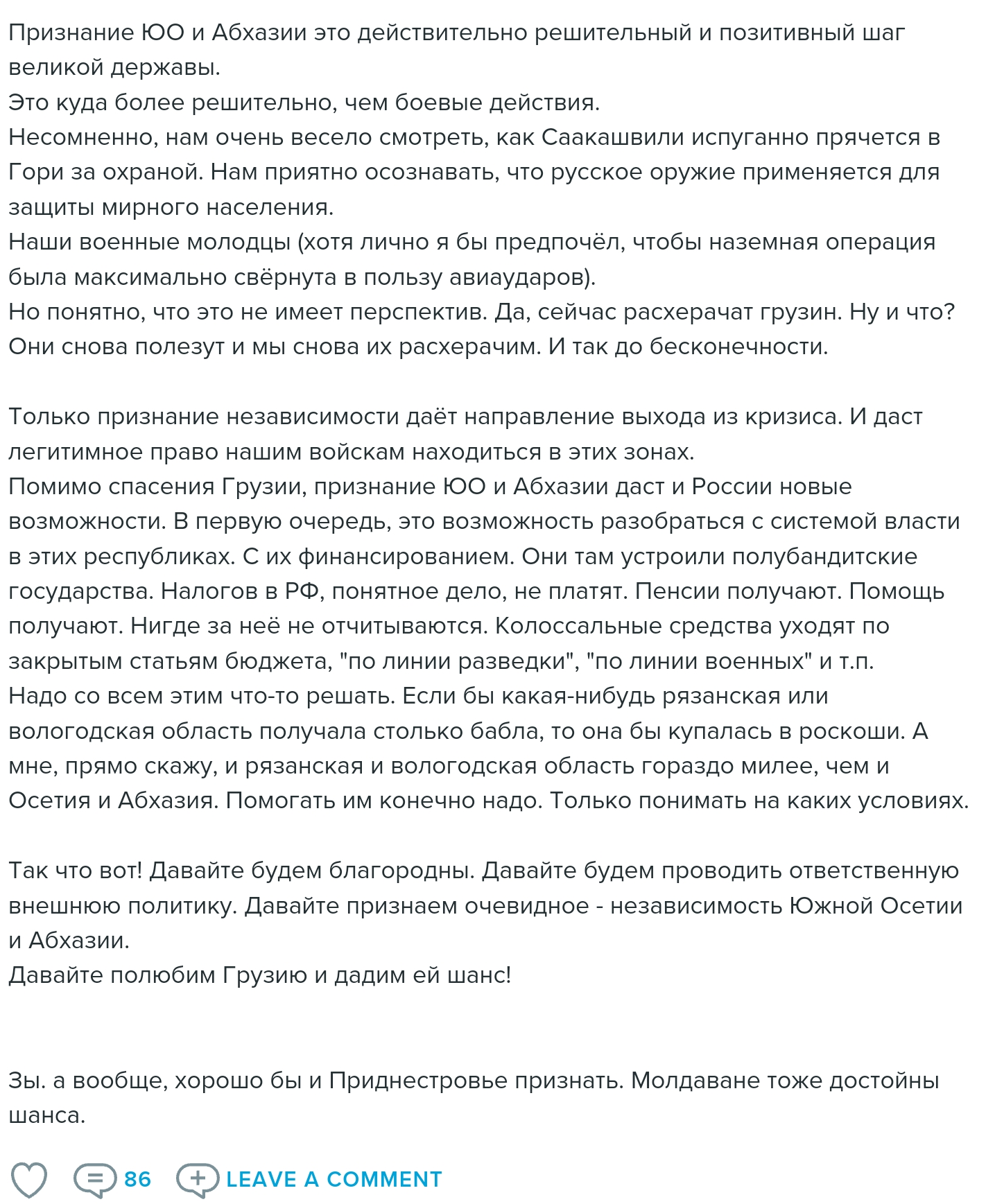 Любой русский, утверждающий, что раньше он был за, а теперь прозрел, только пустите к себе в страну, заслуживает немедленного пинка в сторону родного болота, потому что врёт. Невозможно сначала сладостно созерцать и радостно комментировать фотографии мертвых детей, а потом оба - да это же ужасно на самом деле я нитакой! Нельзя выписаться из людоедов, это, блин, не комсомол.